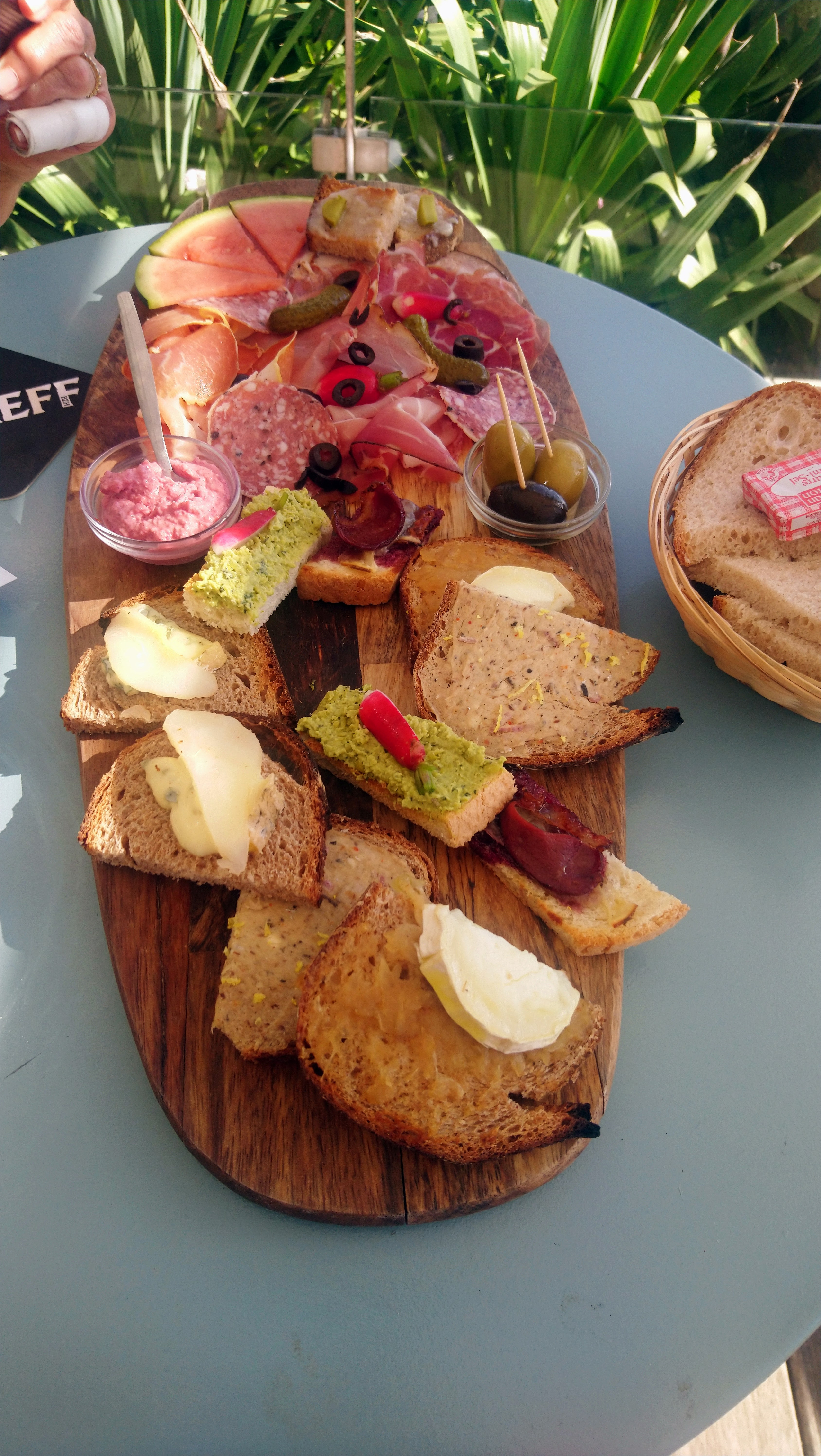 Excellentes planches charcuterie-fromage tartine et cetera la qualité est au rendez-vous la variété également. En revanche s'il fait beau je conseille de réserver parce que les places sur la terrasse avec une chouette vue sont limités. Ils ont leur système de passer de la salle à la terrasse dès qu une place est libre ça c'est sympa parce que dans la salle le jour où j'y suis allée la clim était à fond