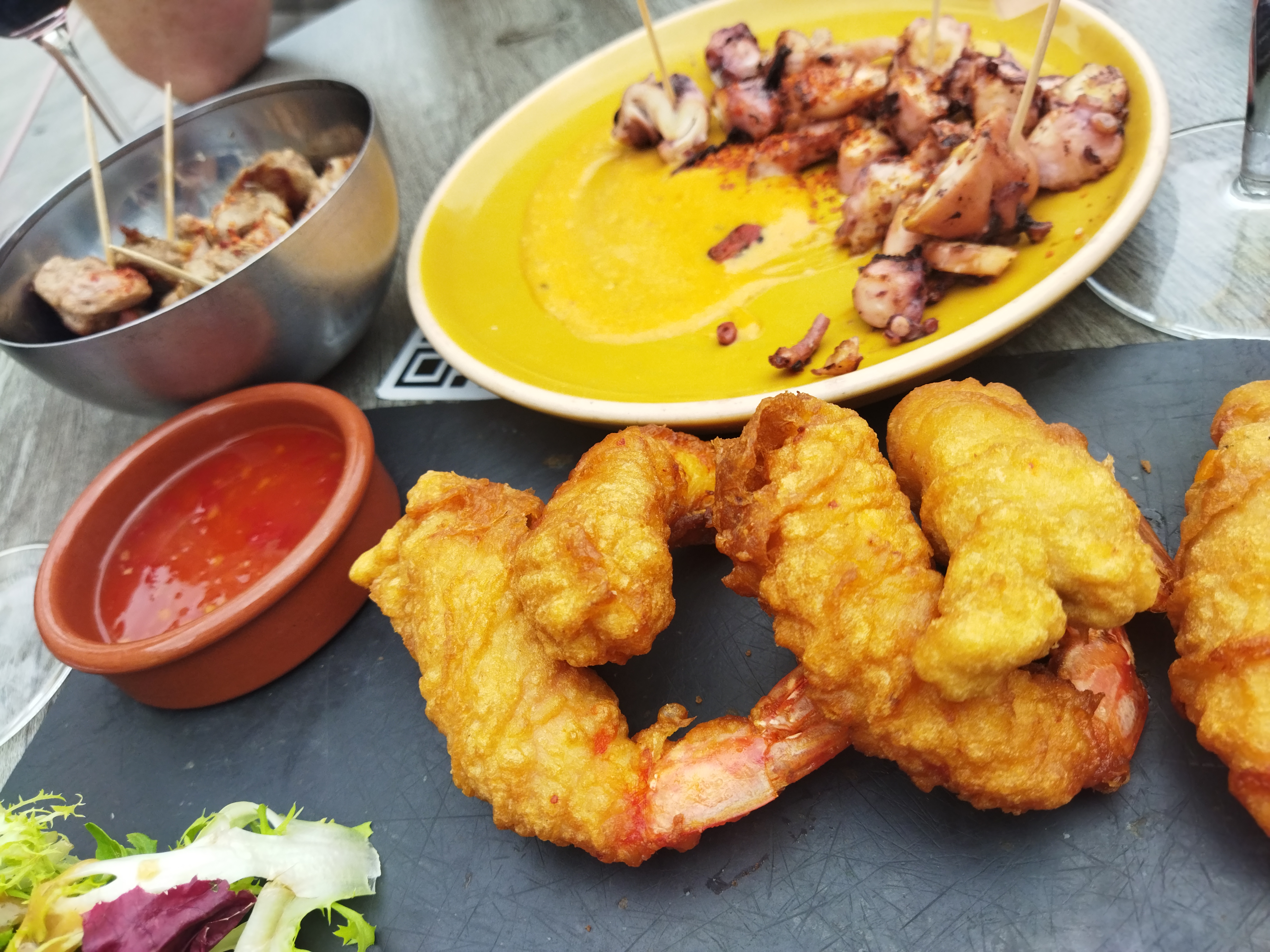 On avait eu un doute en voyant servir un risotto aux gambas à notre voisin de table, garni de 4 tristes petites crevettes. Crainte confirmée en recevant nos coquetas de la taille d'un petit doigt, complètement molles, sans goût, à la panure qui se démontait dans le fond du bol en baignant dans l'huile. Refus de la proposition d'une nouvelle fournée par la serveuse parce qu'on ne voit pas pourquoi on n' avait pas eu les bonnes dès le départ et que, vu la taille ridicule et le goût, de toutes façons, on n'était très loin du standard d'une vraie coquetas. On a préféré ne pas aller plus loin.