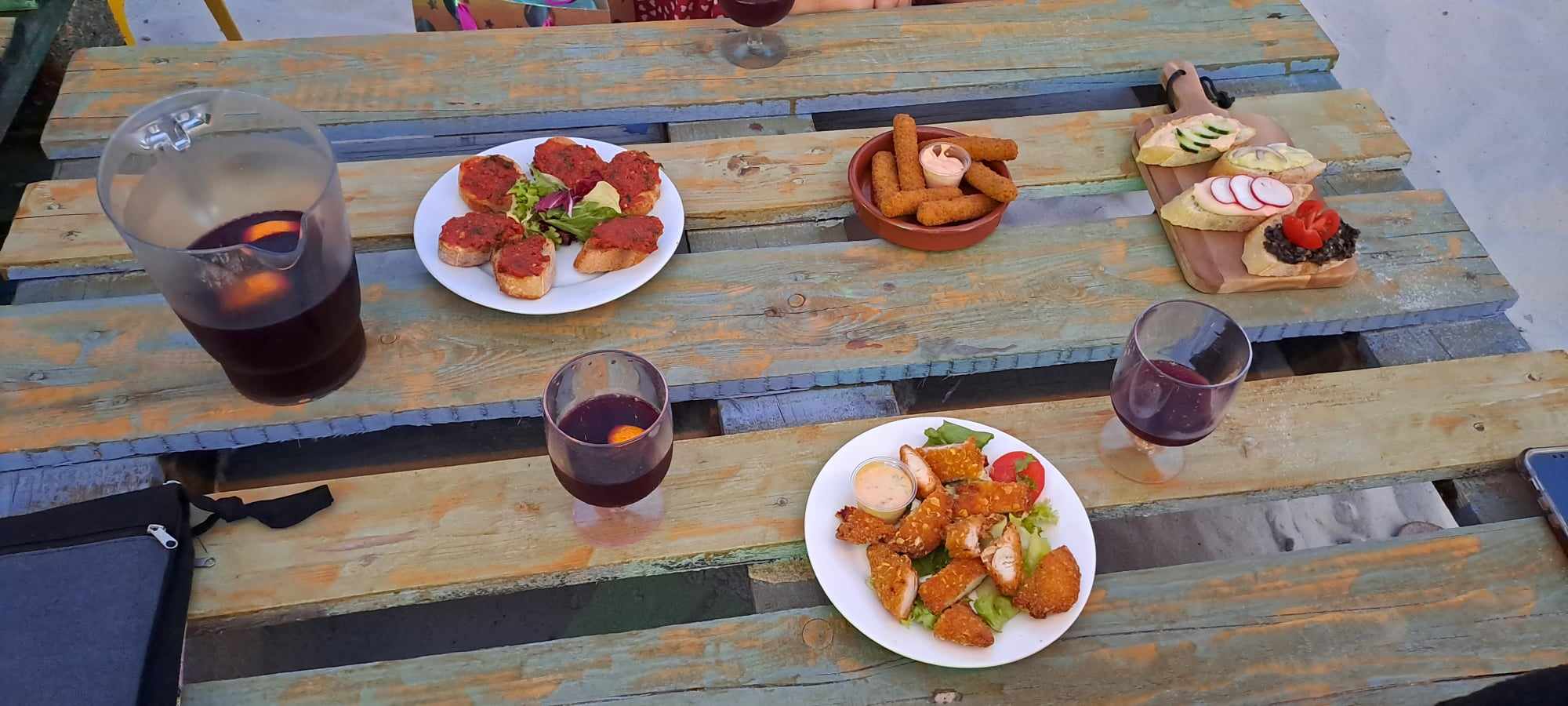 Tapas et cocktail les pieds dans le sable au bord de l'eau dans une ambiance très agréable.