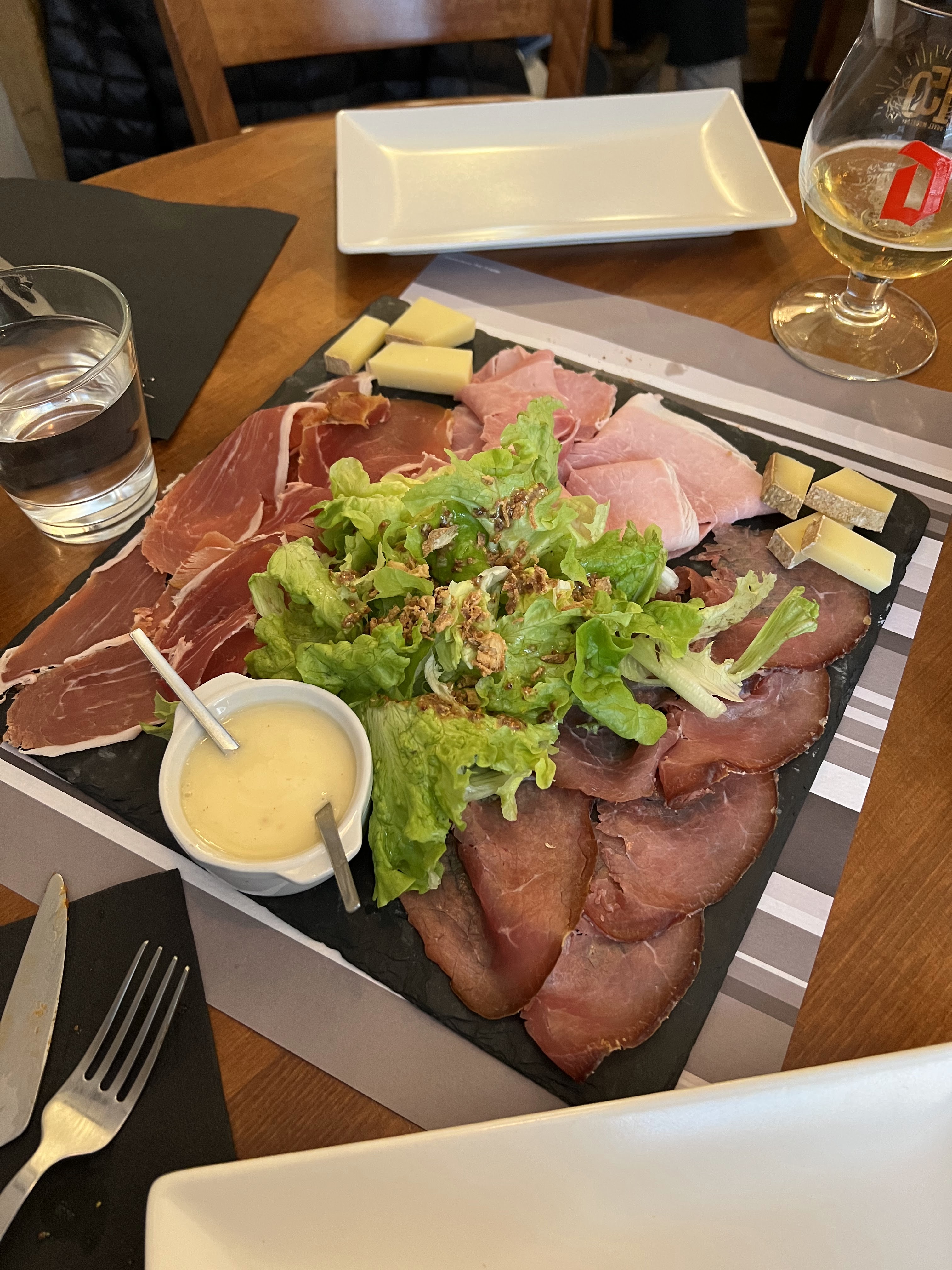 La savoyarde : 17€ pour une personne ! Tomme de vache, meule de Savoie, saucissons, beaufort, reblochon, salade. Un chère par rapport aux autres restaurants mais très bon et service impeccable